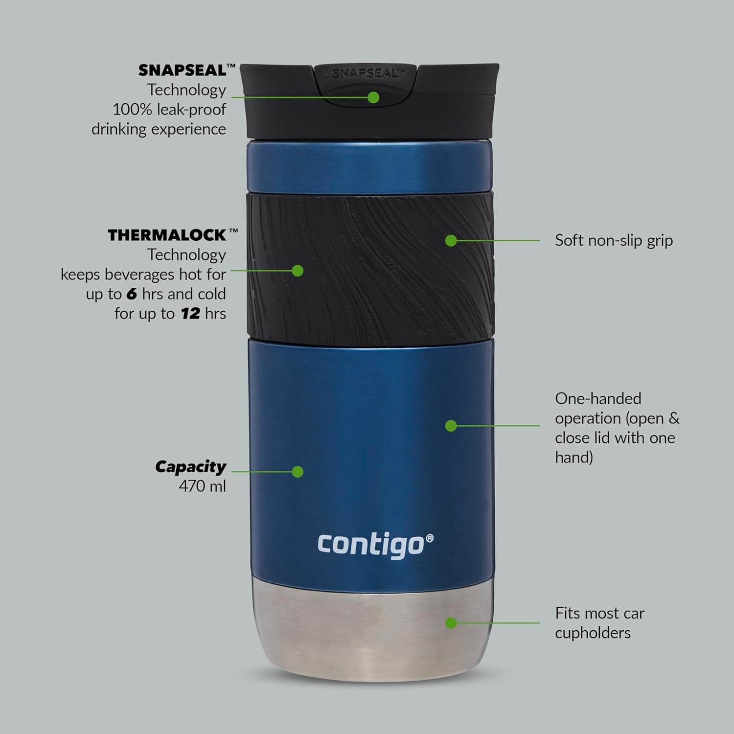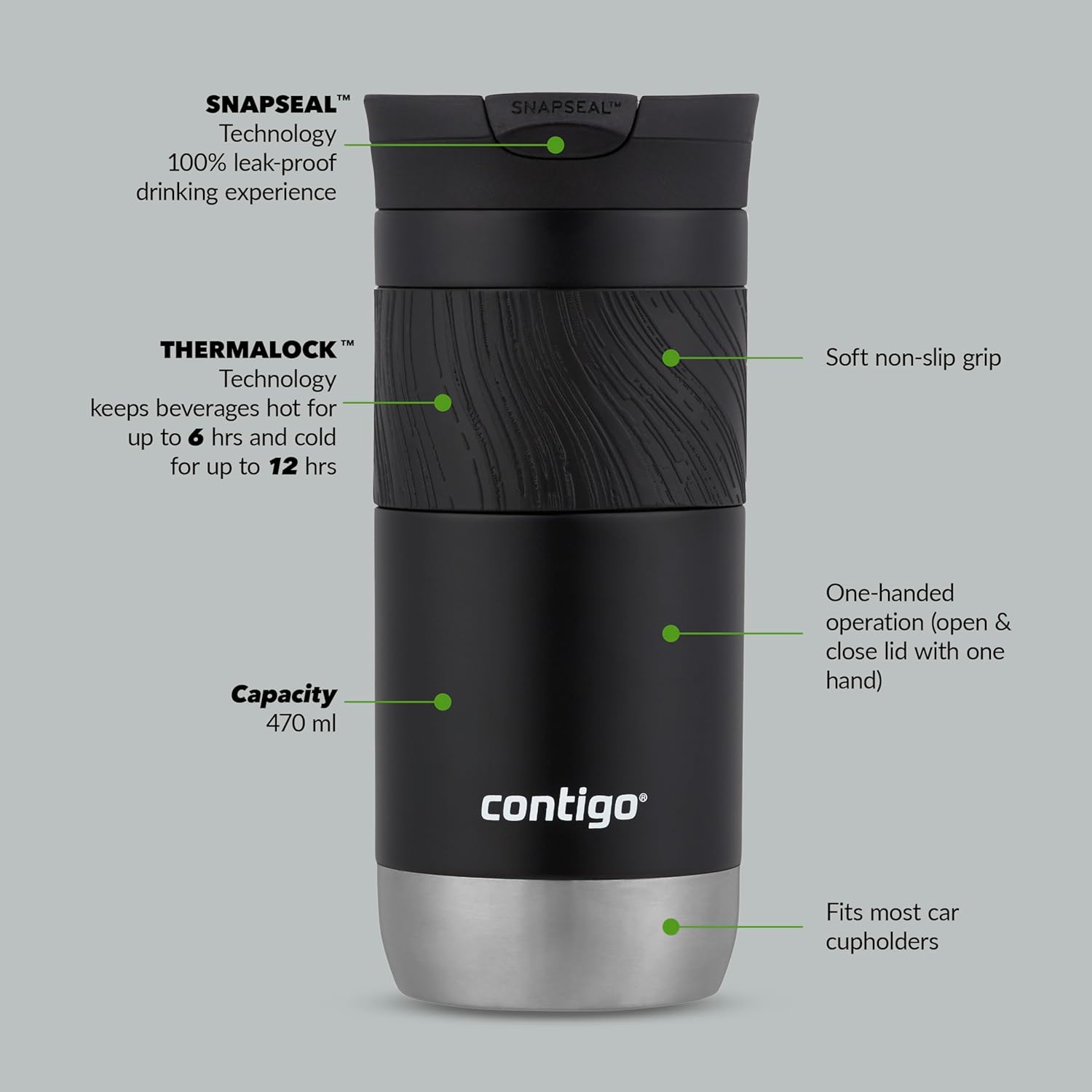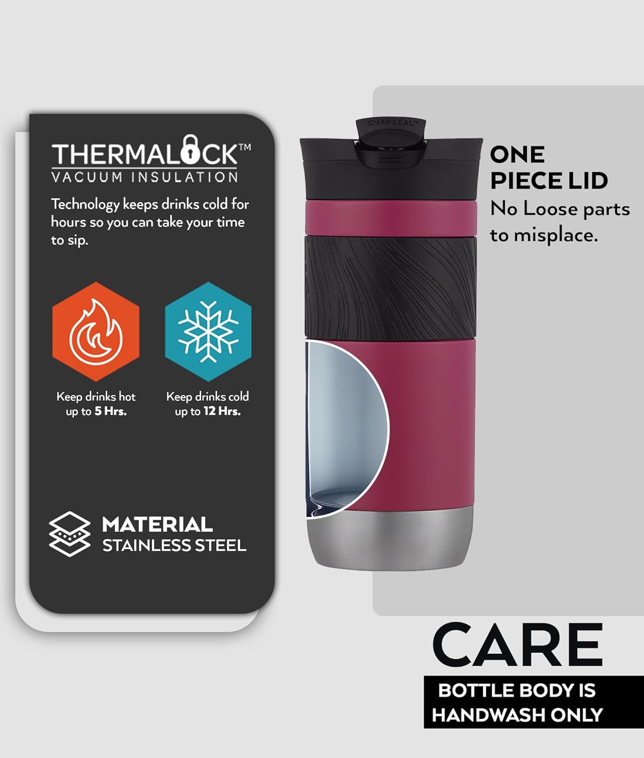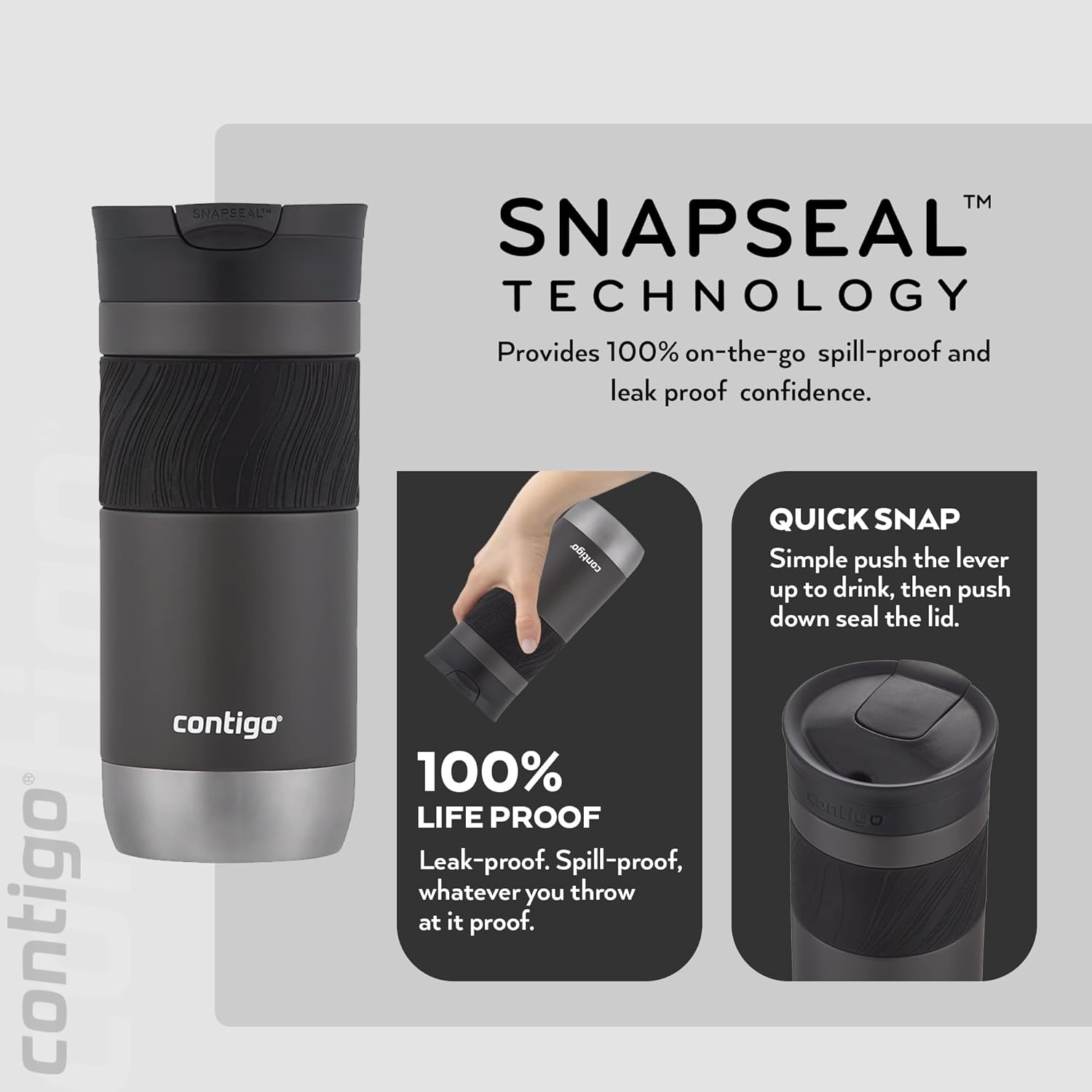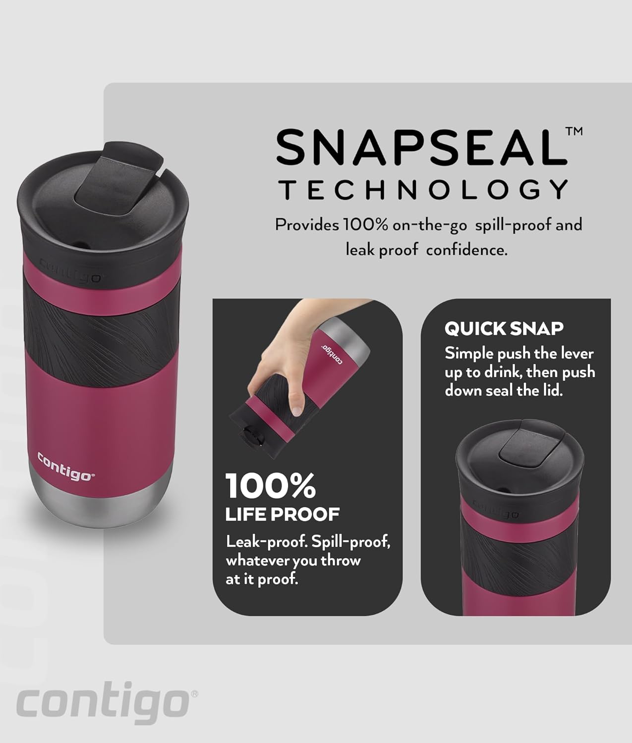 - SAFE and SEALED: The Snap Seal technology is designed for an easy, one-handed drinking experience; when you’re done sipping, simply snap the lid closed for leak-proof protection anywhere you go